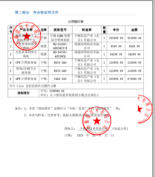 1 服务器 高性能计算平台 详见分项报价表 详见分项报价表 1.00(套) 1,298,000.00 1,298,000.00